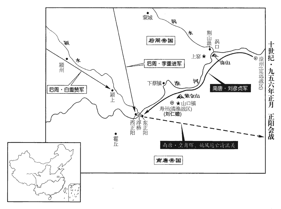 李穀攻壽州‹安徽省寿县›,久不克;唐劉彥貞引兵救之,至來遠鎮‹东正阳·安徽省寿县西南淮河东岸›,九域志:壽州安豐縣有來遠鎮。今按來遠鎮即東正陽,西至渒pài河十里。距壽州二百里,又以戰艦數百艘趣正陽,趣,七喻翻;下同。為攻浮梁之勢。李穀畏之,召將佐謀曰:「我軍不能水戰,若賊斷浮梁,斷,音短。則腹背受敵,皆不歸矣!不如退守浮梁以待車駕。」上‹郭荣›至圉yǔ鎮‹河南省杞县西南圉镇›,九域志:開封雍丘縣有圉城鎮。聞其謀,亟遣中使乘驛止之。比至,比,必利翻,及也。已焚芻糧,退保正陽。丁未‹十三›,帝至陳州‹河南省淮阳县›,九域志:開封府南至陳州三百三十里。亟遣李重進引兵趣淮上。