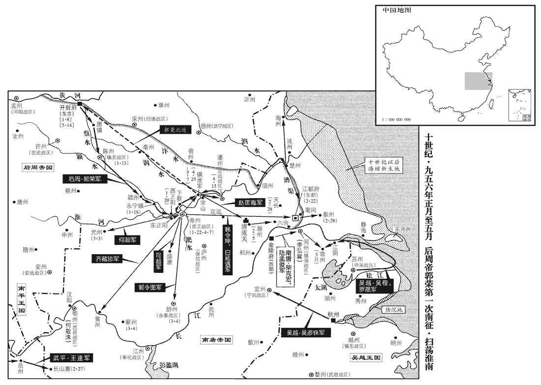 4庚子‹六›,帝‹郭荣(柴荣)›下詔親征淮南,以宣徽南院使、鎮安‹总部陈州›節度使向訓權東京‹首都开封府›留守,端明殿學士王朴副之,彰信‹总部曹州›節度使韓通權點檢侍衛司及在京內外都巡檢。命侍衛都指揮使、歸德‹总部宋州›節度使李重進將兵先赴正陽‹西正阳·安徽省颍上县东南淮河西岸›,河陽‹总部孟州›節度使白重贊將親兵三千屯潁上‹安徽省颍上县›。潁上縣,隋置,唐屬潁州。九域志:在州東一百一十七里。宋白曰:潁上縣,漢慎縣也。南北畫淮為守,關防莫謹於此。隋大業二年,於今縣南故鄭城置潁上縣,以地枕潁水上游為名。壬寅‹八›,帝‹郭荣›發大梁‹首都开封府所在城›。