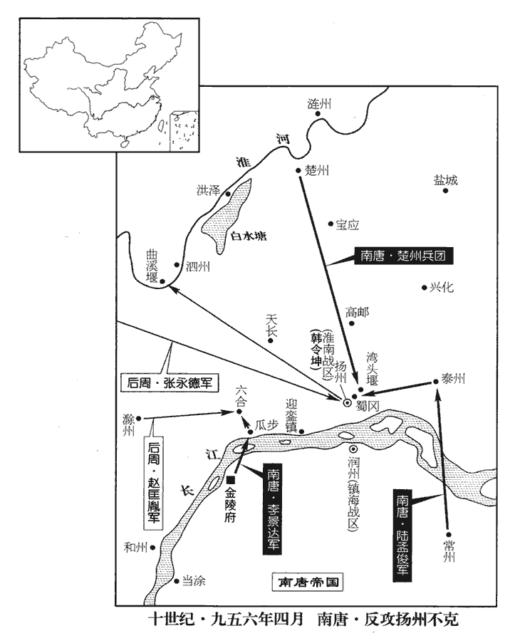 16唐右衛將軍陸孟俊自常州將兵萬餘人趣泰州,九域志:自常州北至泰州一百九十七里。周兵遁去,孟俊復取之,復取泰州。遣陳德誠戍泰州。孟俊進攻揚州‹江都府›,屯于蜀岡‹扬州市西北二千米›,韓令坤棄揚州走。蜀岡在揚州城西。揚州城在蜀岡東南,城之東南北皆平地,溝澮kuài交貫,惟蜀岡諸山西接廬、滁。凡北兵南寇揚州,率循山而來,據高為壘以臨之。今陸孟俊據蜀岡以斷周兵援路,故韓令坤懼而走。帝遣張永德將兵救之,令坤復入揚州。援兵至,故復入揚州。帝又遣太祖皇帝將兵屯六合‹江苏省六合县›。六合縣,屬揚州,在州西北一百三十里。劉昫曰:六合,漢臨淮郡之堂邑縣,晉置秦郡,北齊置秦州,隋置方州,後廢,唐武德初置六合縣。太祖皇帝令曰:「揚州兵有過六合者,折其足!」自揚州西北歸,須過六合,故云然。折,而設翻。令坤始有固守之志。