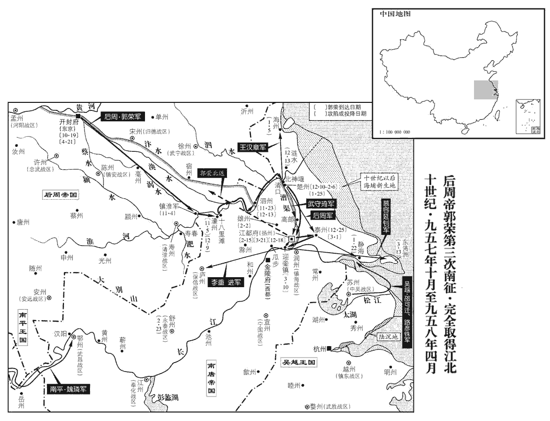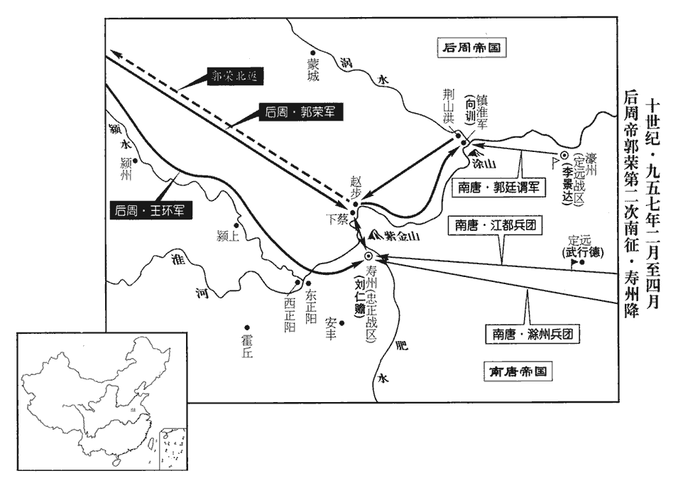 15夏,四月,甲子‹二›,以侍衛親軍都指揮使、歸德‹总部宋州›節度使李重進為廬‹安徽省合肥市›、壽等州招討使,以武寧‹总部徐州›節度使武行德為濠州‹安徽省凤阳县东北临淮关›城下都部署。