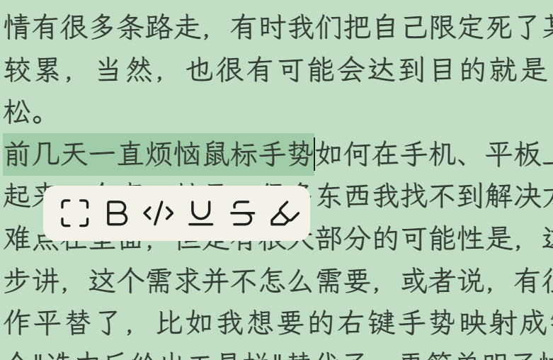 前几天一直烦恼鼠标手势如何在手机、平板上操作的问题,今天突然想起来一个事,就是:很多东西我找不到解决方案,也许有一小部分技术难点在里面,但是有很大部分的可能性是,这个需求并不常见,再进一步讲,这个需求并不怎么需要,或者说,有很大概率被其他更简化的操作平替了,比如我想要的右键手势映射成键盘组合快捷键,就被这个"选中后给出工具栏"替代了,更简单明了快捷
