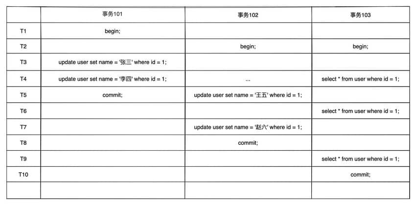 此时情况跟 T6 完全一样,由于已经生成了 Read View,此时依然沿用 m_ids:[101,102] ,所以查询结果依然是 name = 菜花