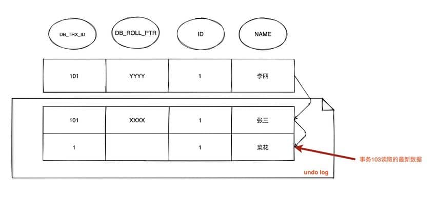 DB_ROLL_PTR找到undo log中的上一版本记录,上一条记录的DB_TRX_ID还是 101,不可见继续找上一条