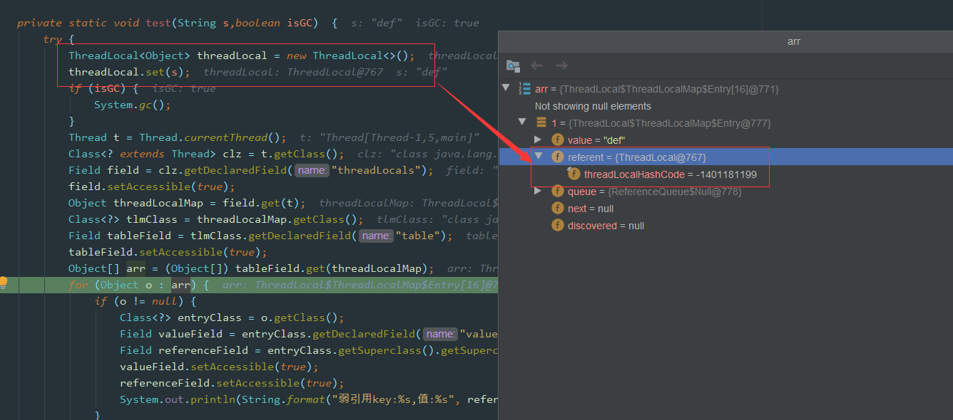 接着再来看下代码,我们使用反射的方式来看看GC后ThreadLocal中的数据情况:(下面代码来源自:
