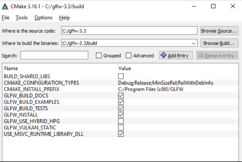安装 CMake 后,您可以选择从命令行或图形用户界面 (GUI) 运行 CMake。为了避免复杂化,我们将使用 GUI。CMake 需要一个源代码文件夹和一个用于存放二进制文件的目标文件夹。源代码文件夹我们将选择下载的 GLFW 源代码包的根文件夹,而构建文件夹我们将创建一个名为 build 的 新目录,然后选择该目录。 ~~我用的是cmake3.31.11和visul studio 2022,以及glfw3.3.10 https://github.com/glfw/glfw/releases/download/3.3.10/glfw-3.3.10.zip ~~