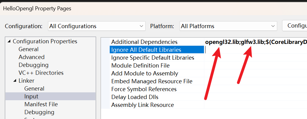 由于 VS 现在可以找到所有必需的文件,我们终于可以通过转到 Linker 选项卡并 Input ,将 GLFW 链接到项目中: