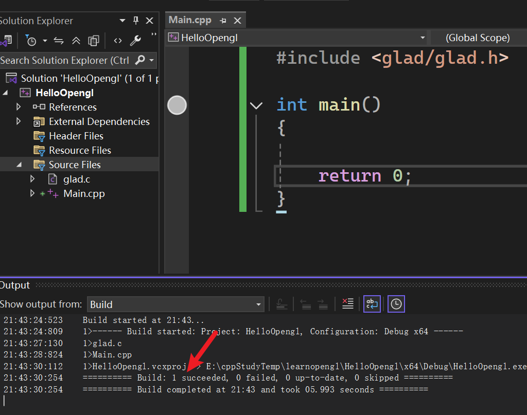 点击编译按钮后应该不会出现任何错误,此时我们就可以进入 下一章 ,讨论如何使用 GLFW 和 GLAD 配置 OpenGL 上下文并生成窗口。请务必检查所有包含目录和库目录是否正确,并确保链接器设置中的库名称与对应的库文件匹配。