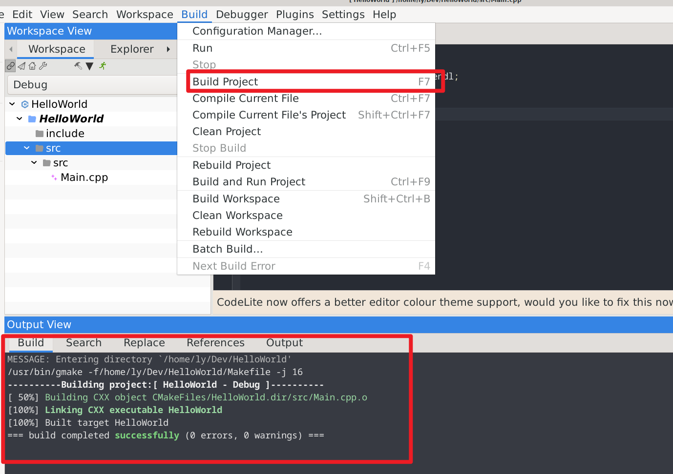 codelite HelloWorld.workspace编译整个项目