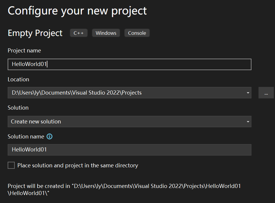 不要勾选 Place solution and project in the same directory解决方案,solution,是一组相互关联的项目,他们有各种项目类型,解决方案就像工作台,每个项目本质上是一组文件,会编译成目标二进制文件(无论是库还是实际的可执行文件)