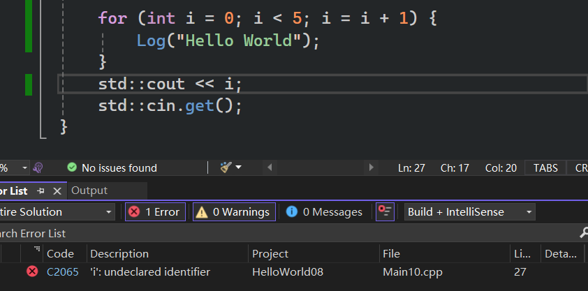 for (int i = 0; i < 5; i++) { if ((i + 1) % 2 == 0) break; std::cout << i; Log("Hello world!"); } /* 0Hello world! */return ,直接退出函数