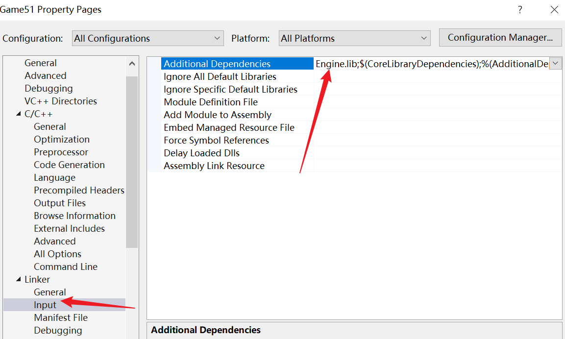 - 如果使用方法1,如果Engine的名字改了,那么Engine.lib名称也会改,则需要在Game51项目右键中,修改