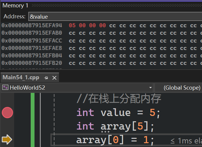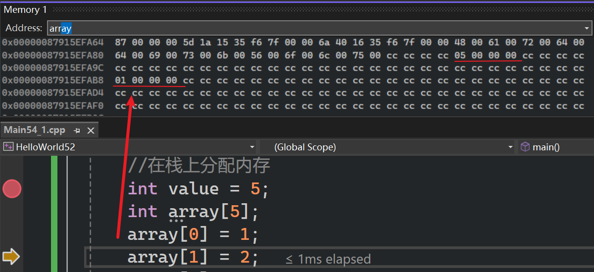 接下来看看在栈上分配一个整数,和在栈上分配其他数据的差异。与实际c++代码的堆相比