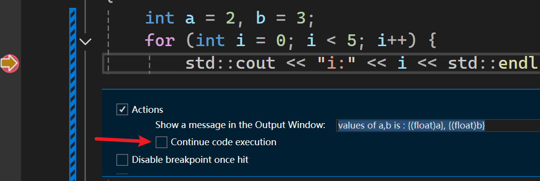 这个contine code execution如果勾上了,则调试时不会停止,会直接跳过该断点