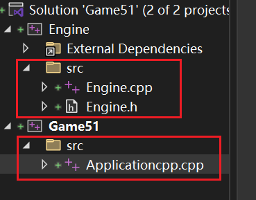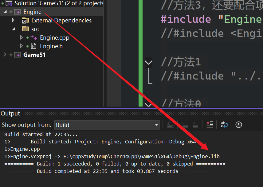 1>Engine.vcxproj -> E:\cppStudyTemp\ChernoCpp\Game51\x64\Debug\Engine.lib //这里自动编译了Engine,因为Game添加了engine reference