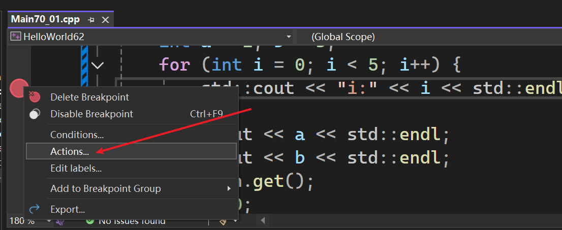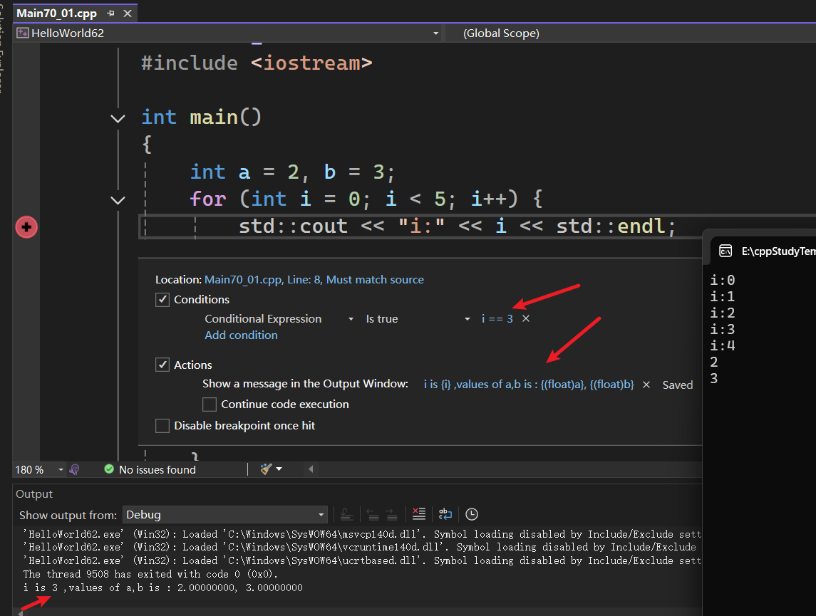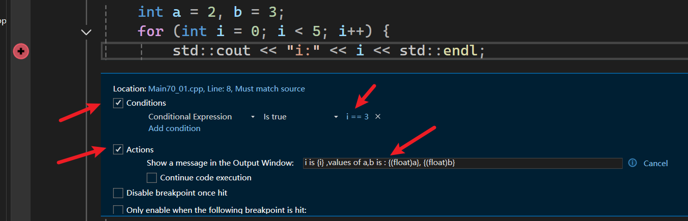 i is {i} ,values of a,b is : {(float)a}, {(float)b} - 然后设置Condition,设置为